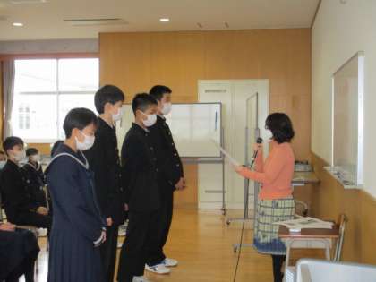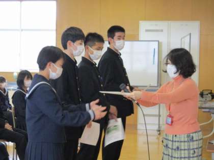金沢校外学習の事後学習で「オリジナルちらし」を作成しました。特にキャッチフレーズがすばらしかった作品を生徒が審査し、票が多かった4人に学年主任より賞状を授与しました。