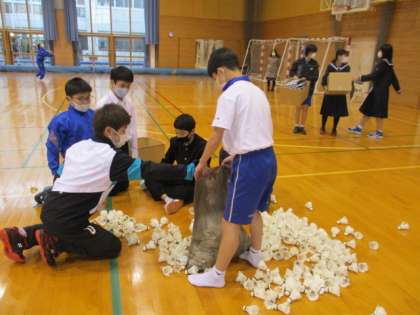 環境ボランティア委員会運営の「Club Clean Room」活動として、男子バドミントン部も支柱やネット等を置いてある小さな部屋を掃除しました。あまり使っていないネットをきれいにたたみ直したり、シャトルを分別したりしました。その後、コートや道具、仲間に感謝しながら練習をしました。