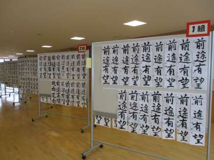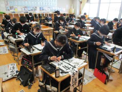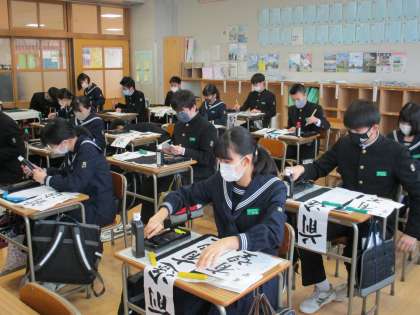 今日は、始業式の後、中学校では最後となる書き初め大会を行いました。今年の題目は「前途有望」。明るい未来がきますようにと願いを込めて書きました。