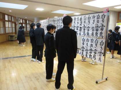 国語の時間に、鑑賞会として、お互いの作品を見る時間を設けました。じっくりと鑑賞しながら、クラスをまたいで、友達の筆遣いのよいところを参考にしたり、普段は見えない仲間のいい所に気付く機会になったりしています。