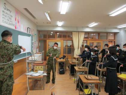 後半には、2名の自衛官の方々が「役に立つロープの結び方」を実演して下さり、生徒達は覚えようと何度も結んだり、教え合ったりする様子がみられました。