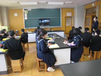 生産技術の講座では、理科室にて三菱ケミカル(株)富山事業所樹脂製造部生産技術グループの川本匠先生からリモートによる講義を受けました。生産している素材や生産工程についての専門的な知識や会社で働くことの意義について分かりやすく説明して下さいました。