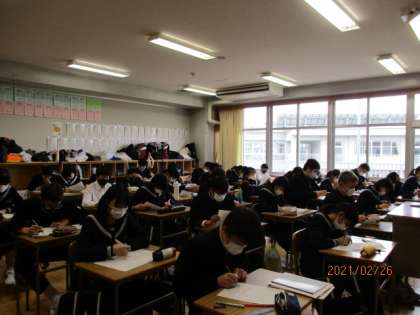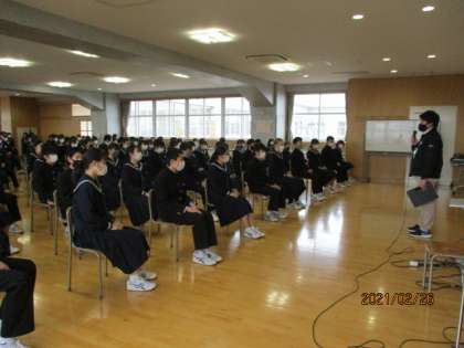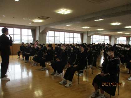 「2年3学期は、3年の0学期」を合い言葉にしてきた3学期も残りわずかとなりました。まもなく最上級生となります。そこで今日は、生徒会担当や学年生徒指導担当より、来年度を意識した生活についてや5月に行われることになった体育大会について話をしました。
