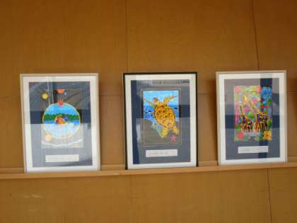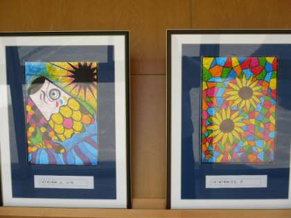 渡り廊下にある展示スペース「呉中ギャラリー」に美術で作成したプッシュスタンドの作品が展示されています。動物や植物などをステンドグラスのように色とりどりの色で彩色しました。