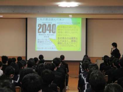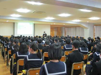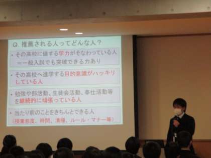 総合的な学習の時間「進路学習」の一環として、今年度は、自分の事を知り、職業を知るという学習をしてきました。今後、将来の自分を思いえがき、進路を決めていくために、今日は進路の情報を知ってもらおうと、学習担当から話をしました。
