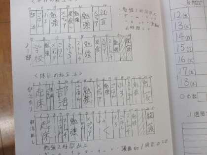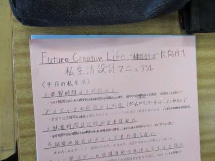 先日の学年総会での決定を受け、Future Creative Life“未来創造生活”に向けた試行が始まります。1学年耕心委員会で作成した私生活設計マニュアルをもとに、各自の生活スタイルについて考えました。12日(金)〜18日(木)の1週間、設計した私生活を実践してみます!