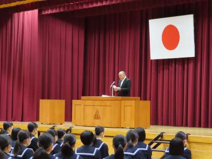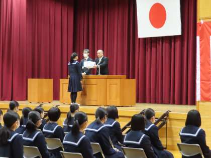 その後、代表生徒が記念品として印鑑とコサージュをいただき、お礼の言葉を述べました。