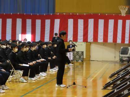 PTA会長さんをお迎えして、卒業記念品の贈呈式を行いました。初めに会長さんからお祝いの言葉をいただきました。試練を克服して新たな目標を目指している水泳の池江璃花子さんの姿から前向きに考える生き方を学びたいというお話を忘れないようにしたいですね。