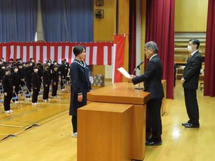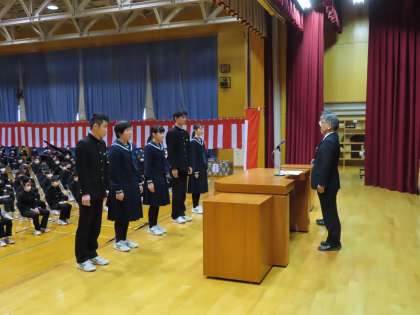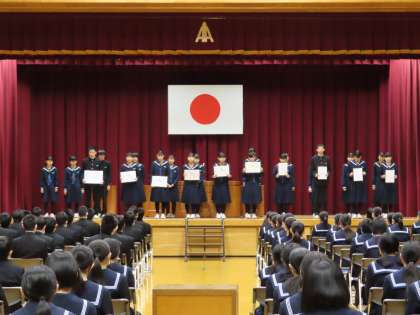 続いて各分野で活躍し、3学期に表彰された生徒を紹介しました。県中学校体育連盟、県中学校文化連盟からの3年間の実績に対する表彰、書道、美術、新聞感想文等の作文、NIE学校賞等の受賞を紹介しました。温かい拍手で称えながら、身近な友達の活躍から大いに刺激を受けました。