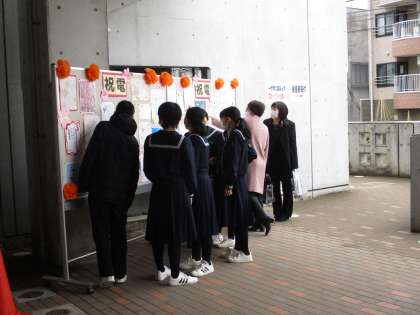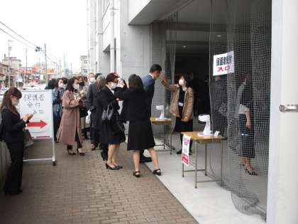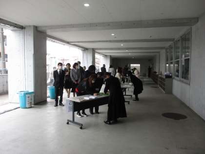感染症対策をしながらの受付となっています。来校された保護者の皆様には、いろいろなご協力をありがとうございます。保護者受付近くにお祝いメッセージを掲示させていただきました。
