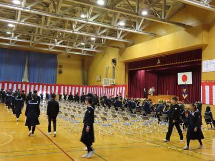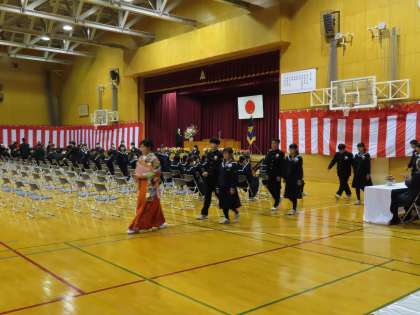卒業生がマスクを外して堂々の入場です。自席に着席と同時にマスクを着用しました。様々な形で感染症対策を講じながら、メリハリをつけての式の開始です