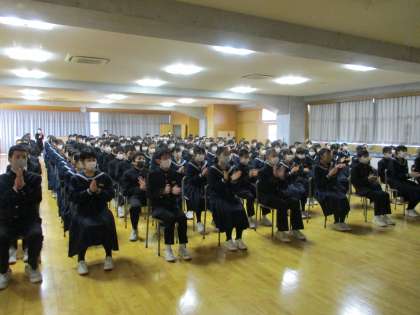 会場の密を避け、座席間の距離を十分に取るため、1年生はランチルームから映像を見ながら拍手を送りました。