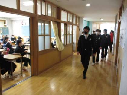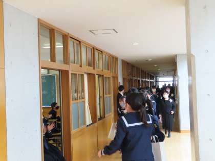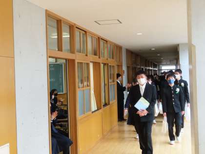 歓送は、感染症対策を意識して、3年生が思い出の校舎の中を巡って、在校生が教室から見送る形で実施しました。在校生の温かい拍手をバックに、思い出多き学舎から旅立っていきました。