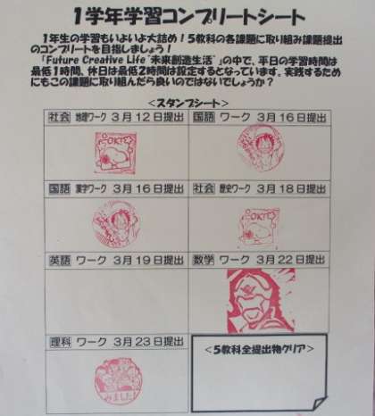 1学年の生徒たちは、今年1年間の5教科の学習を総復習するため、『学習コンプリートシート』に挑戦しています!各教科で使用しているワークを最後まで取り組み、教科担当から完了のスタンプをもらいます。“スタンプラリー”のように、生徒たちのシートには色々なスタンプが集められています。