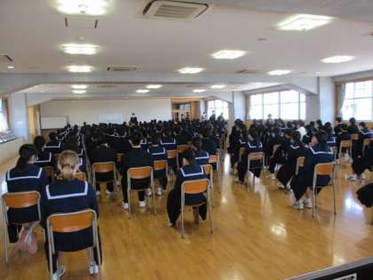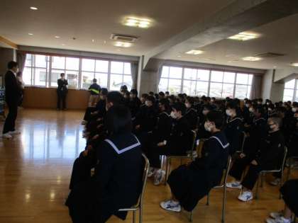 3年生になって初めての学年集会を行いました。学年担当者から自己紹介があり、この1年間をどのように過ごしてほしいかなどの話がありました。また、5月に予定している体育大会のリーダーの発表もありました。