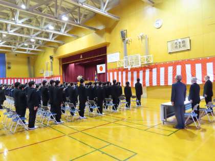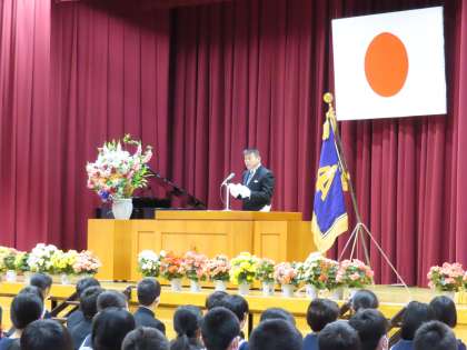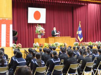 校長式辞では、入学生に向けて「なりたい自分をしっかりもって、なれる自分をふやしていこう」「困った時には先輩を頼ってほしい」という言葉がありました。また先輩に当たる本校出身の大関朝乃山関が校訓「聡明、勇気、友情」に沿った実践を積み重ねながら力を付けて、今の地位についた経過についての説明がありました。