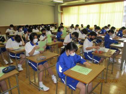 「新入生のしおり」の読み合わせをしました。小学校と違う部分も多くあり、少し戸惑いをみせる生徒たちでした。呉中生として、当たり前のことを当たり前にできるように心がけていきましょう。
