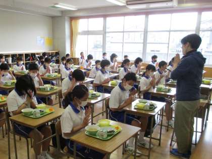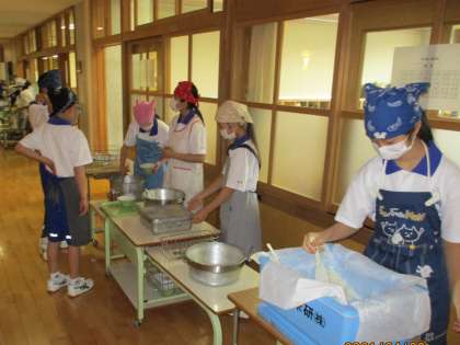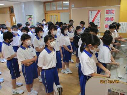 給食前は、どの生徒も時間をかけてきれいに手洗いをしていました。マイエプロン・マイ三角巾姿も似合っていますね。中学校での初めての給食準備に、少し時間がかかってしまいました。来週は時間短縮に努め、ゆっくり食事ができるといいですね!