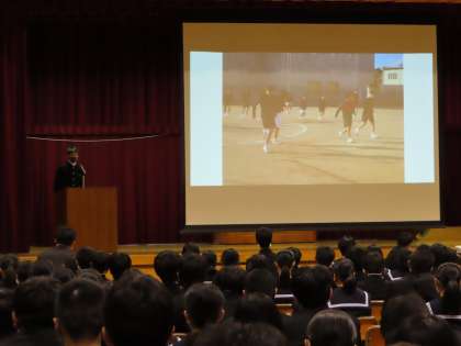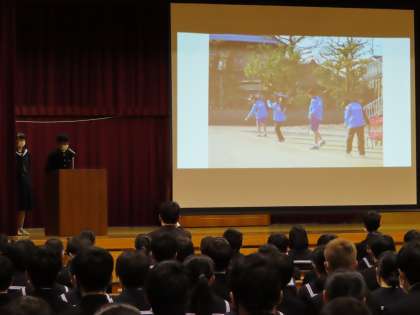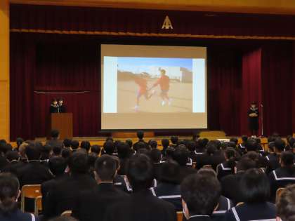 生徒会入会式に続いて、1年生の仮入部、見学を控えて、各部の紹介をしました。各部の部長が映像を活用して、各部の様子を紹介し、アピールしました。本日の部活動見学、明日からの仮入部期間を経て、悔いのない選択をしてほしいです。