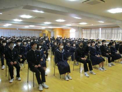 今日は、総合的な学習の時間で、これから学習する「平和学習」についてのガイダンスを行いました。この秋に行われる修学旅行に向けて、平和学習の課題設定の仕方や平和学習の背景についての説明を受けました。しっかりと目的をもって、積極的に課題追究や調べ学習ができるように頑張りましょう。