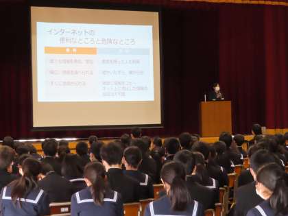 中央警察署から講師をお招きして、ネットトラブルに関わらないための知識を得るために全校でお話をお聞きしました、