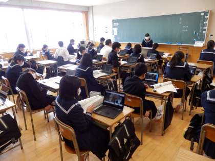 今回の生徒総会は、密を避けるために体育館に全校で集まるのではなく、各教室で参加する形で行いました。放送を聞いたり、ディスプレイを見たり、クロムブックを活用したりと、各教室でできる形で進めました。放送室、生徒会室、そして校長室も待機場所として活用する、まさに「だれも見たことのない」総会でした。