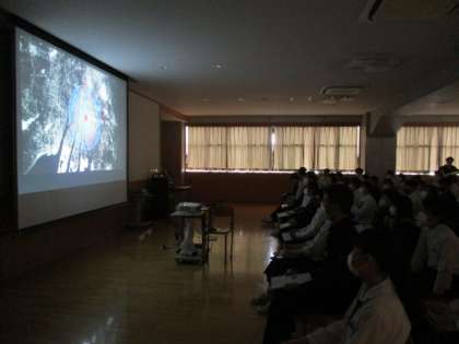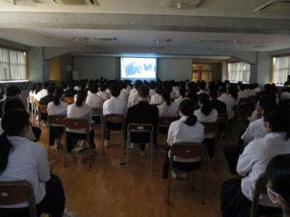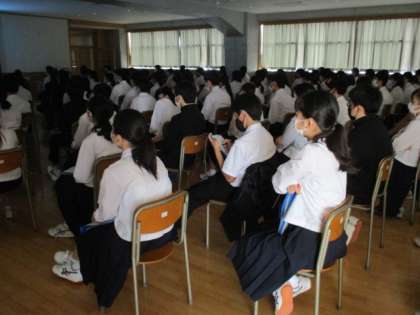 広島原爆についての映像を視聴し、被爆者が話す当時の状況を、生徒たちはメモを取りながら真剣に聞いていました。