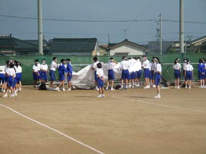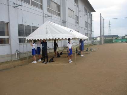 いよいよ体育大会当日になりました。朝から係生徒が早く登校し、みんなでで準備を進めました。天候の都合で開始を遅らせましたが、力を合わせて開会に向けて、準備をしました。