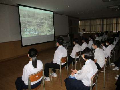 平和学習では、広島に落とされた原子爆弾についての映像をみて学習してきました。今日は富山大空襲の映像を見ました。富山でも戦争での被害が大きくあることを知り、驚いている生徒もいました。自分の考えをもち、これからの学習を進めていきましょう。