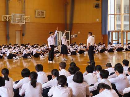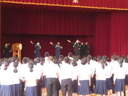 続いて特設応援団を中心にしたエールが贈られ、全校生徒の手拍子で合わせました。大会でも、全校生徒の応援の思いを胸に頑張ってきてほしいです。