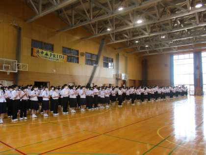 6月18日(金)から富山市選手権大会が始まります。各部活動の健闘を祈るため、生徒会を中心に壮行会が行われました。一年生は出場する選手は少ないですが、先輩のために一生懸命エールを送りました。来年にむけて、意欲を高めている生徒も多くいました。それぞれの部活動が全力を尽くし、悔いのない大会となりますように。