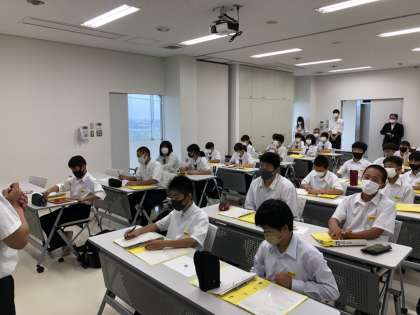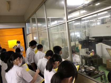 石金精機さんの本社工場を見学する班では、最初に会議室で富山県のものづくり産業の状況や会社の様子を説明していただき、その後、ものづくりの現場を見学しました。CM や写真などではなく生で見る様子に迫力や緊張感、働く魅力を直接感じることができたようです。その後、働く喜び、コロナ禍の影響などについて、質問したことに答えていただきました。