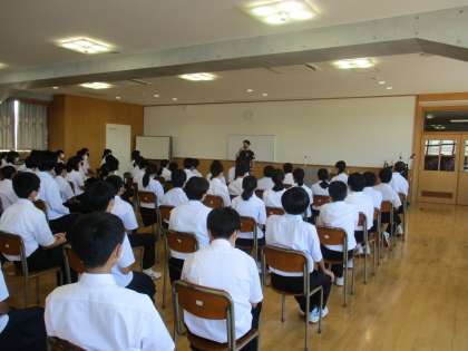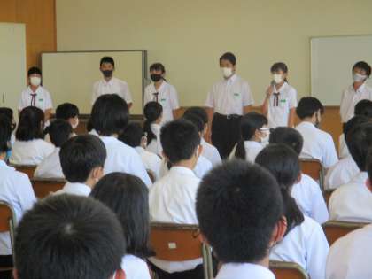 6限目に学年集会を行いました。各クラスの級長がクラスの1学期よかった点と2学期への抱負を話しました。その後担任の先生から夏休みの「部活動」、「交通安全」、「学習」、「生活」「体験に基づいた夏休みの過ごし方」について話しました。有意義な夏休みを過ごし、2学期に向けて「なりたい自分」をもち、「なれる自分」を増やしていきましょう!