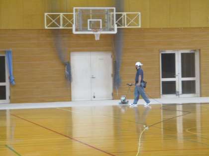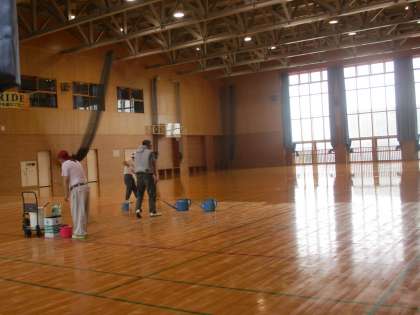 夏休み期間を利用して、専門業者に入っていただいて、校舎の廊下等のワックス清掃、高所作業車を使った窓清掃等をしていただきました。そして学校閉庁期間の部活動停止期間を利用して、本日は体育館フロアのワックス清掃をしていただきました。暑い中、丁寧に作業を進め、きれいに仕上がりました。