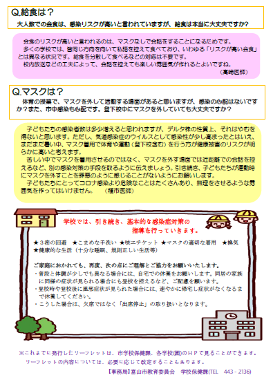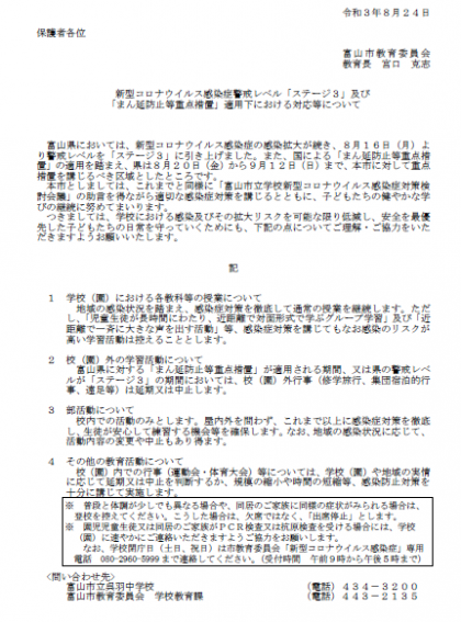 富山市教育委員会より、2学期の開始を控えて、学校における感染症対策等に関する保護者各位への文書が届きました。