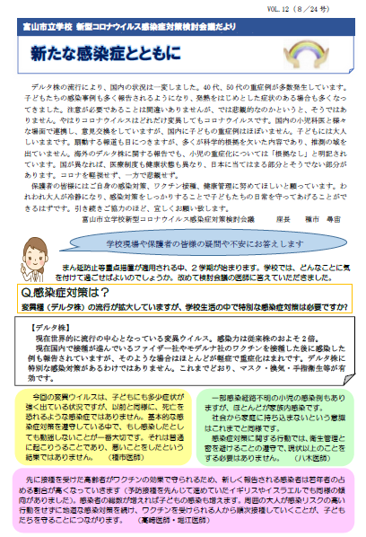 また、感染症対策検討会議だよりVol12(8/24号)も出されました。今回は変異種(デルタ株)の流行に関する見解、学校での給食やマスク着用に関する話題、学校での感染症対策やご家庭での対策についてのお願いが中心です。下記【感染症対策検討会議だよりVol12(8/24号)】をクリックして閲覧ください。