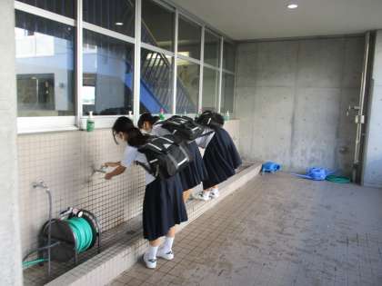今日から2学期がスタートしました。生徒玄関での検温、学年ごとの場所での手洗い、各教室での体調確認など、感染症対策をこれまで以上に徹底しながら学校生活を始めています。