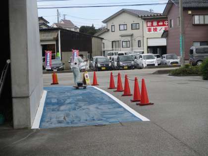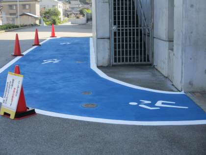 部活動の時間等に敷地内で走っているコースで、駐車場横の見通しの悪い所に、ペンキとピクトグラムを活用した走路を描いていただきました。レーンをはみ出さずに走るように心がけてください。また、駐車場の近くなので、レーンの効果を過信せずに、今後もスピードを落とすなど、注意を怠らないでください。