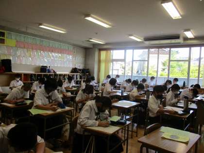 中間考査の範囲表を配布し、中間考査までの勉強計画を作成しました。期末考査で計画をたてた経験を生かし、より具体的に計画を立てることができました。期末考査の点数を超えていけるように、共に頑張っていきましょう!