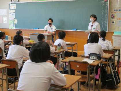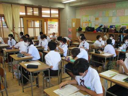 10月に予定されている校外学習の事前学習がスタートしました。今日は、学年生徒会から「スローガン」と「しおりの表紙絵」募集のお知らせがありました。校外学習の内容を聞いて、生徒たちの表情にも笑みが見られました。