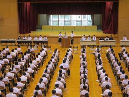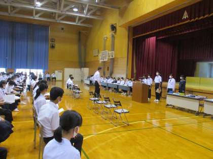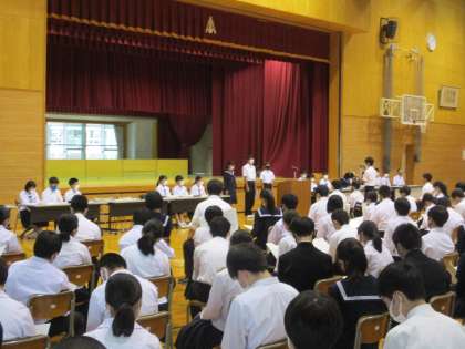 1学期は、コロナウィルス感染症の状況を考えて、各教室でリモート形式で行ったので、今回が、今年度全校が体育館で一堂に会しての初めての総会となりました。