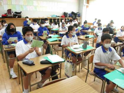 今日の学活の時間に、校外学習のしおり製本と読み合わせを行いました。自然と生徒たちの顔もほころび、楽しみにしていることが伝わってきました。校外学習まで残り10日。しっかり準備を進め、当日を迎えましょうね!しおりの表紙絵は「表紙絵コンテスト」の最優秀賞作品です。