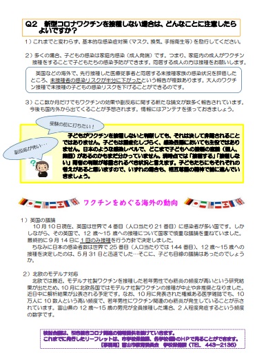 今回のリーフレットには、新型コロナワクチンを接種する場合の注意点や接種しない場合はどんなことに注意したらよいかが書かれています。ご一読ください。