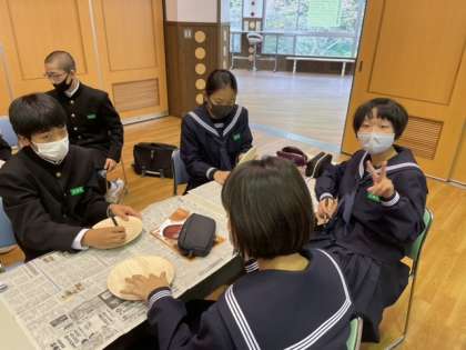 庄川ウッドプラザにて、木皿の絵付け体験を行なっています。教えていただいた手順やコツを実践しています。