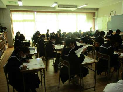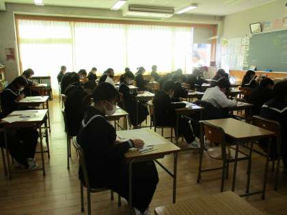 昨日に引き続き、中教研学力調査が行われました。一限目、社会科、2限目、数学があり、今まで培ってきた知識をさまざまな角度から問われていました。期末考査の範囲と重なるところもあるので、しっかり復習しましょう。