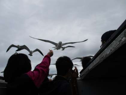 飛んでいるカモメにエサやりをして盛り上がっていました。