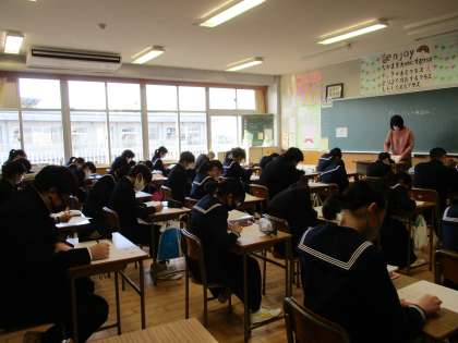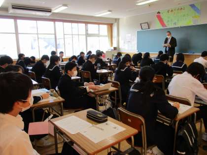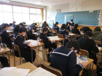 全国中学生人権作文コンテストの優秀作文を担任の先生に読んでもらい、聴いた感想をワークシートにまとめました。聴き終わった後、「人権」について真剣に考えている姿が印象的でした。