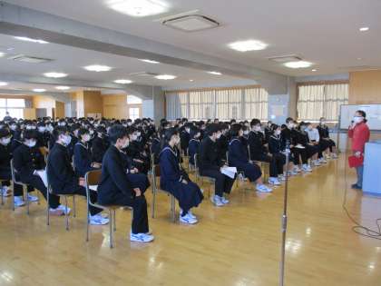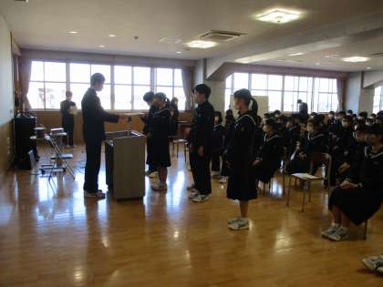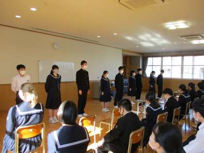 始めに、学年生徒会から2学期を振り返っての発表、そして、各クラスのMVPの表彰もありました。また、先生から冬休みの過ごし方、3学期(卒業)に向けて、受検について等の話がありました。