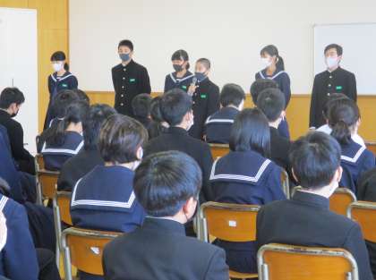 2学期最後の学年集会を行いました。各クラスの級長が2学期を振り返って良かったことや3学期向けてがんばっていきたいことを述べました。また、校外学習の俳句を1学年の先生方がセレクトし、表彰しました。いよいよ明日は終業式です。一年を振り返り、来年につなげていきましょう。