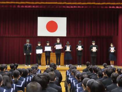 2学期終盤にいろいろな大会で優秀な成績を収めた運動部、ポスターや思考大会、柔術などで表彰された皆さんを紹介する場をもちました。ひとりひとり得意な分野、打ち込んでいる分野は様々です。それぞれの活躍に対して全校で温かい拍手を贈りました。